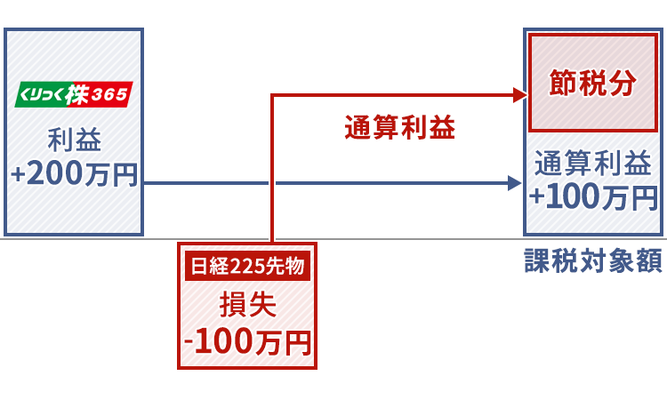 譲渡益を計算するときに「くりっく株365」は、「くりっく365」や取引所以外のFX(為替証拠金取引)、日経225先物といった証券先物取引、商品先物取引等との損益を差し引き計算することができます。これを損益通算といいます。