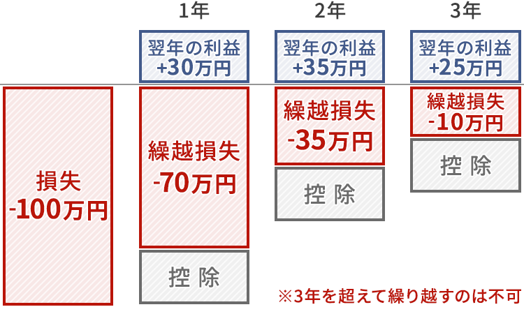 「くりっく株365」の取引で損失が出た場合、損益通算を行った結果、その年に控除しきれない損失額が発生した場合、その損失を翌年以降3年間に渡って、為替証拠金取引や他の先物取引で発生した利益から控除することができます。