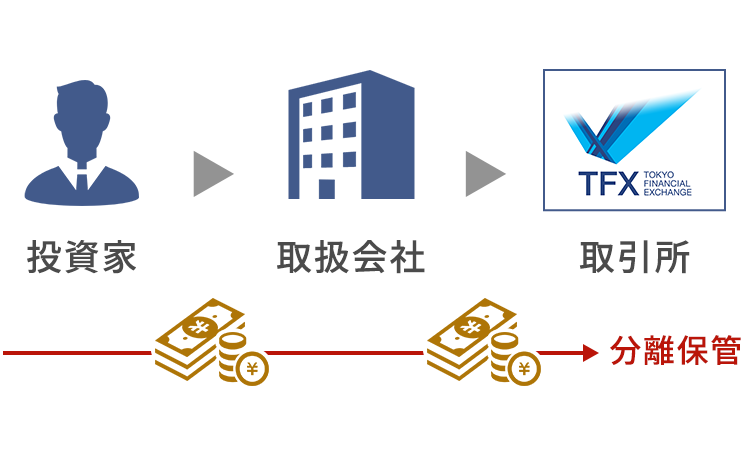 投資家の証拠金は全額取引所に預託されます。取引所は預かった証拠金の全額を取引所の財産と分別保管するため、取扱会社に万一のことがあっても、証拠金は原則保全される仕組みとなっています。
