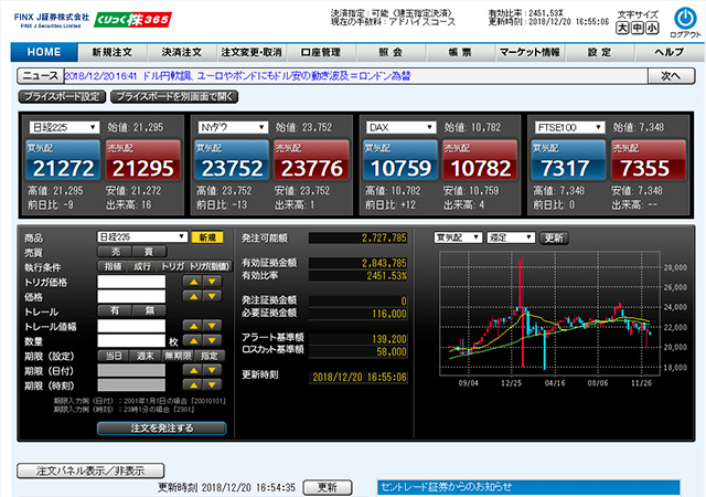 注文までの過程を簡略化し、チャートや、気配画面などからすぐに注文できることが、取引のタイミングを逃さない最大のポイントです。FINX J証券の、くりっく株365 オンライン取引システムは、簡易的に、直感的に、効率的に取引できるよう考え抜かれ、投資家の投資機会を逃しません。