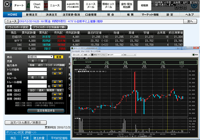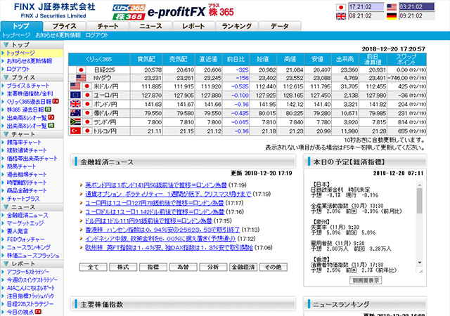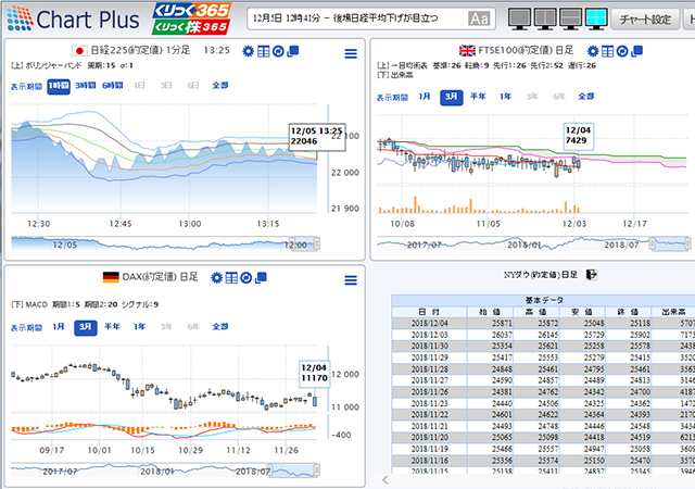 リアルタイムの時価情報のほか、株価指数や金融経済に関連する最新ニュース、多彩なテクニカルチャート機能やマーケットレポート等、多彩な情報が一画面で確認できる高機能な情報分析ツールです。「くりっく株365」口座を開設されているお客様は、「e-profitFXプラス株365」が無料でご利用いただけます。