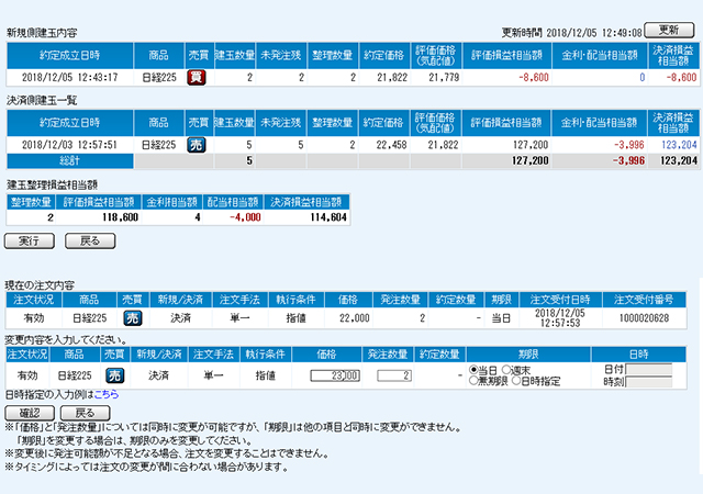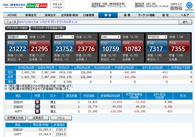 仮想価格を設定し、保有している建玉に対しての評価損益がシミュレーションできます。また、仮想の建玉を作成して、口座状況の変化をシミュレーションすることも可能です。
