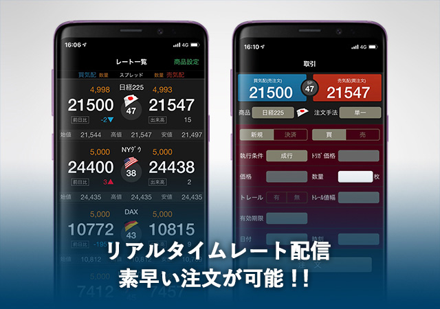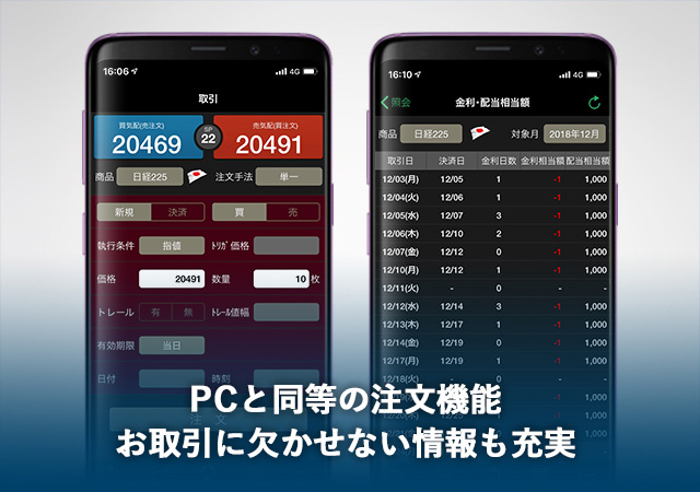単一、IFD、OCO、IFO、ストリーミングなどPCと同等の注文機能で、いつでもどこでもチャンスを逃すことなく、お取引が可能です。また、金利・配当相当額カレンダー(くりっく株365)などお取引に欠かせない情報も充実しています。
