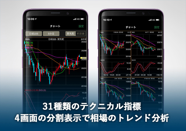 リアルタイムのチャート描画にくわえ、31種類の豊富なテクニカル指標や自動トレンドライン表示でチャート分析を強力にサポートします。2画面、4画面の分割表示で相場のトレンド分析も可能です。