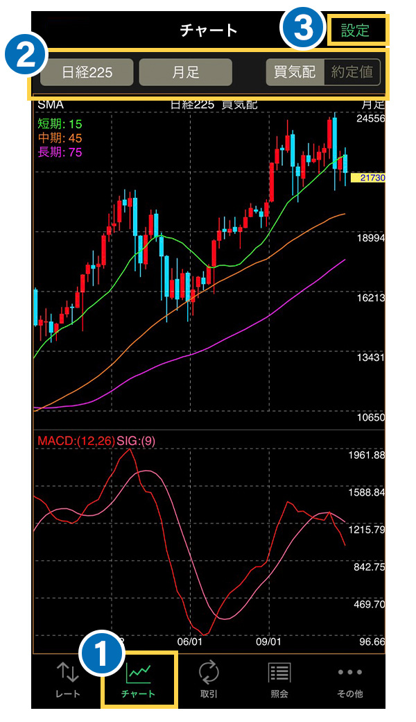 画面下部の【チャート】メニューをタップすると、チャート画面が表示されます。