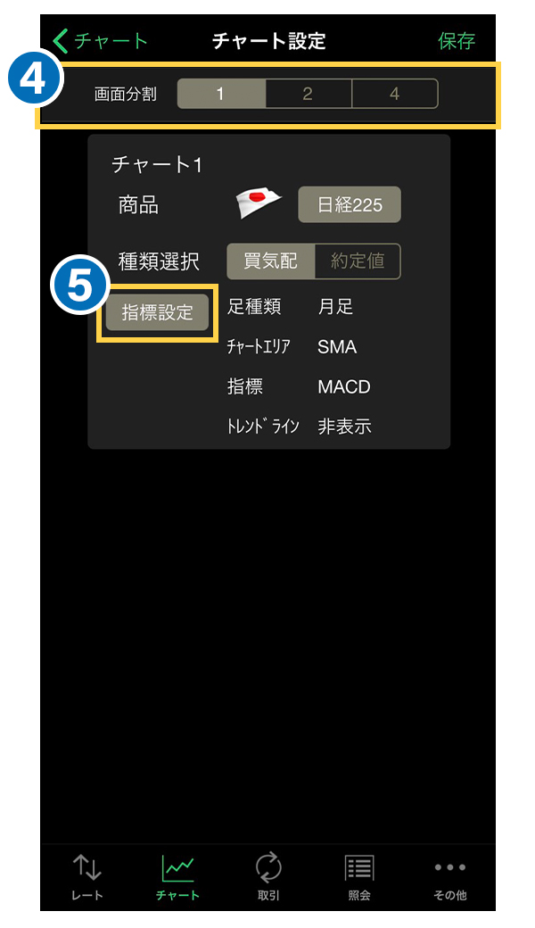 【設定】より、画面の分割表示やテクニカル指標の設定ができます。