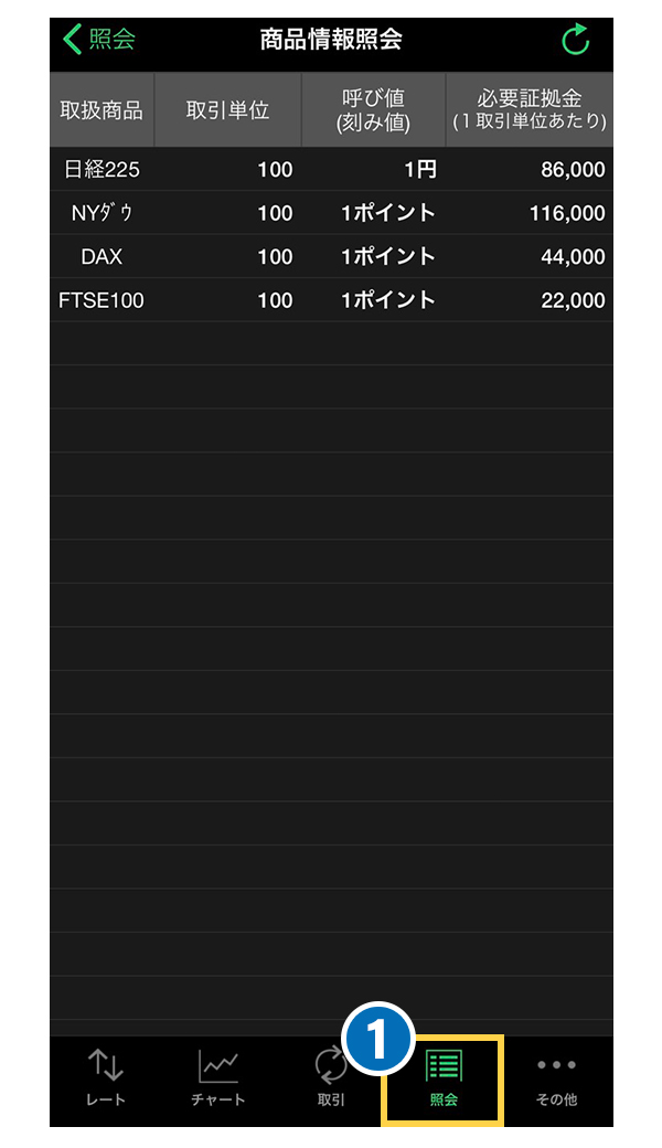 各商品の「取引単位」や「呼び値」、「必要証拠金」が確認できます。
