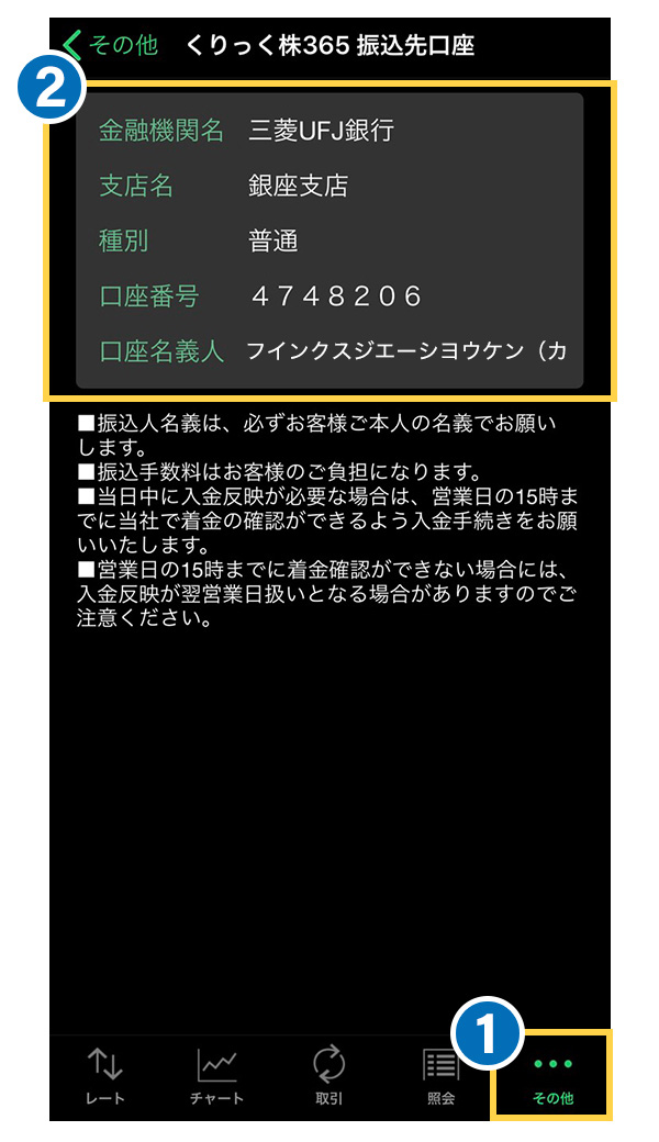 FINX J証券くりっく株365取引口座へ入金するための振込先口座をご確認いただけます。